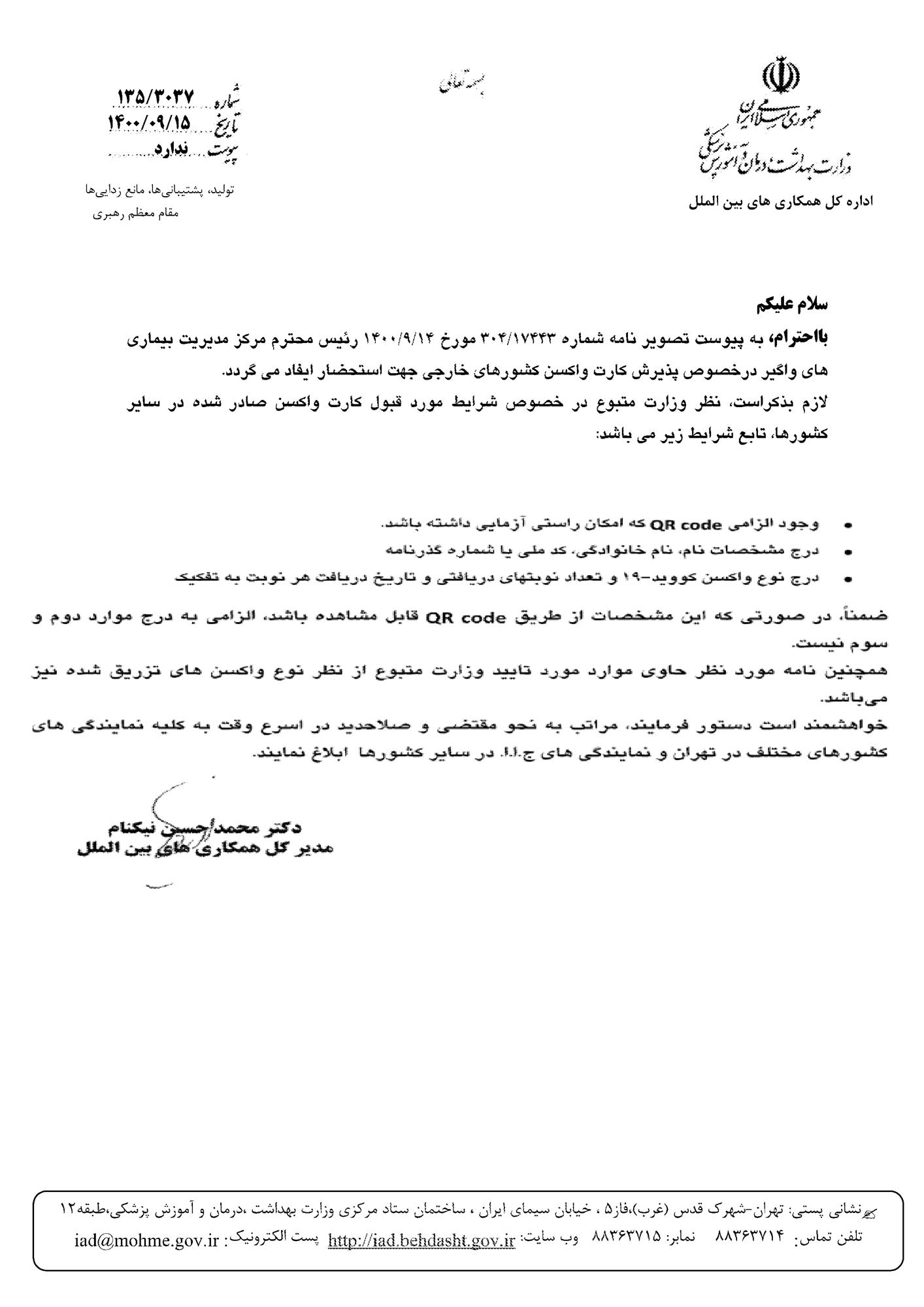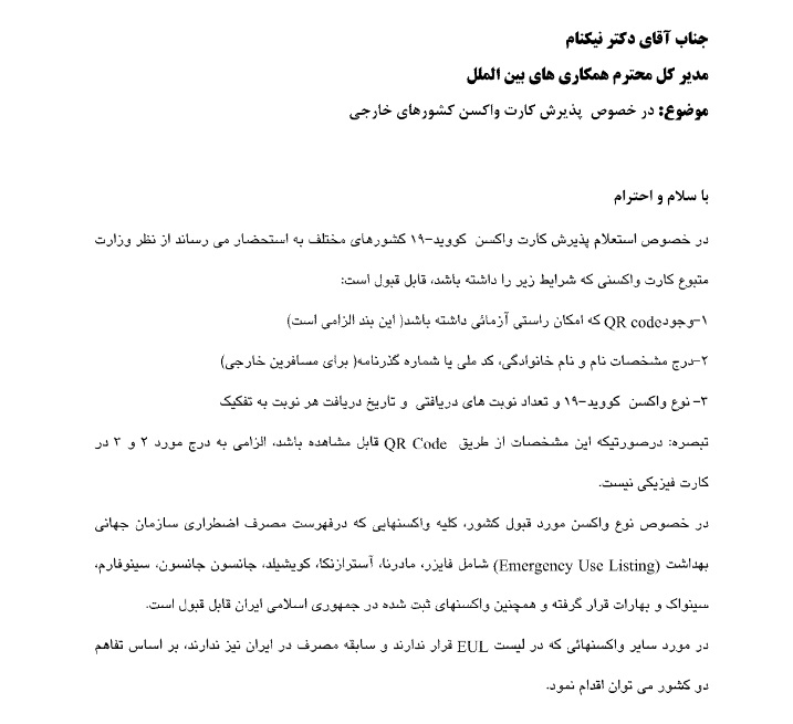 در خصوص پذیرش کارت واکسن کشورهای خارجی